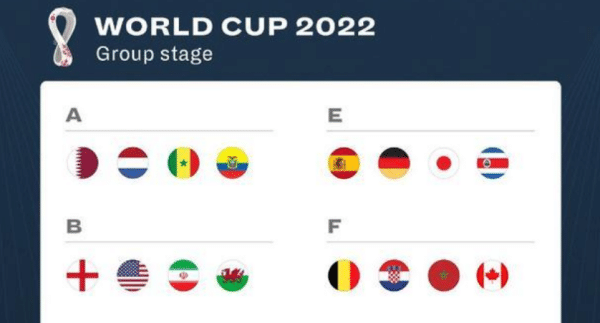 32强分组如下:A组:卡塔尔(A1)、厄瓜多尔(A2)、塞内加尔(A3)、荷兰(A4) B组:英格兰(B1)、伊朗(B2)、美国(B3)、威尔士(B4) C组:阿根廷(C1)、沙特(C2)、墨西哥(C3)、波兰(C4) 。